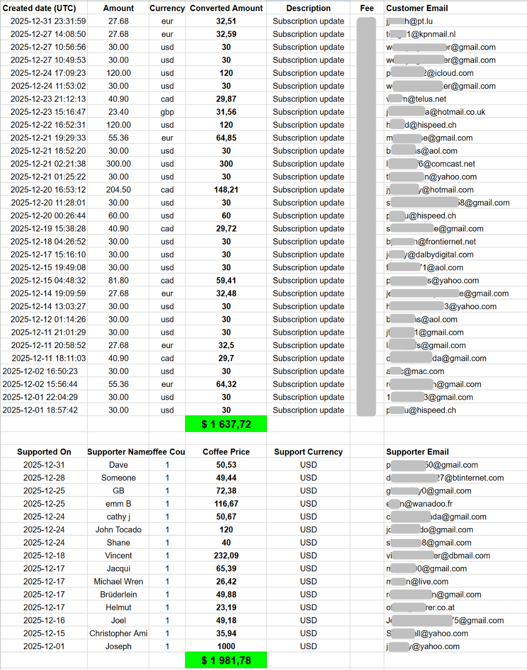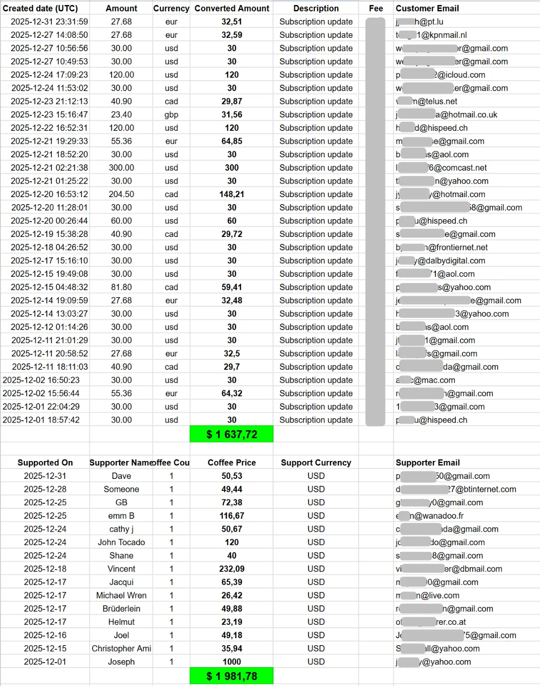 | DECEMBER 2024 | 1.970$ (34 donations+13 subscribers) | 5.890$ |