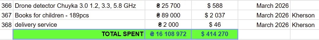March 2026 ResultsYour contributions: $3506In total, our foundation spent $2670 You can sign up for a monthly donationYou can choose the amount of your donation. |
